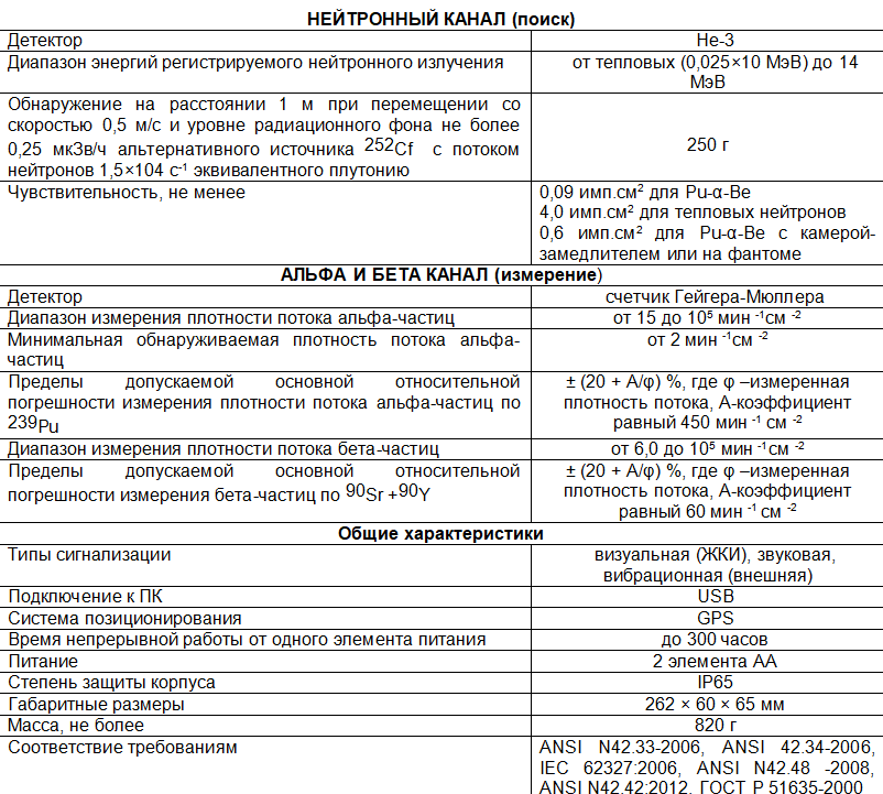 Оборудован встроенными детекторами альфа, бета, гамма и нейтронного излучения.